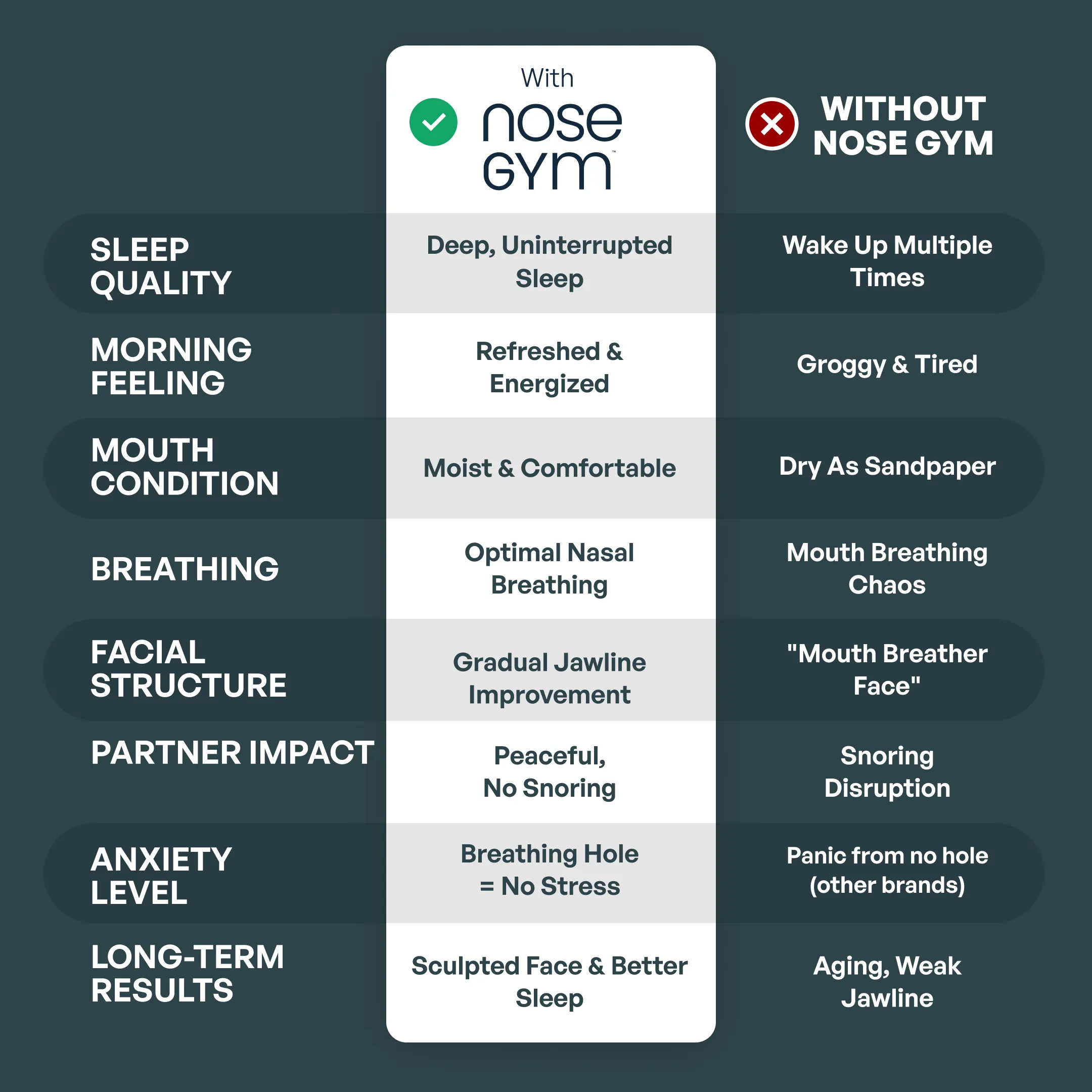 Nose Gym supports optimization of sleep quality, nasal breathing, and facial structure. Most users report feeling dramatically better sleep within just 3 nights of using Nose Gym.